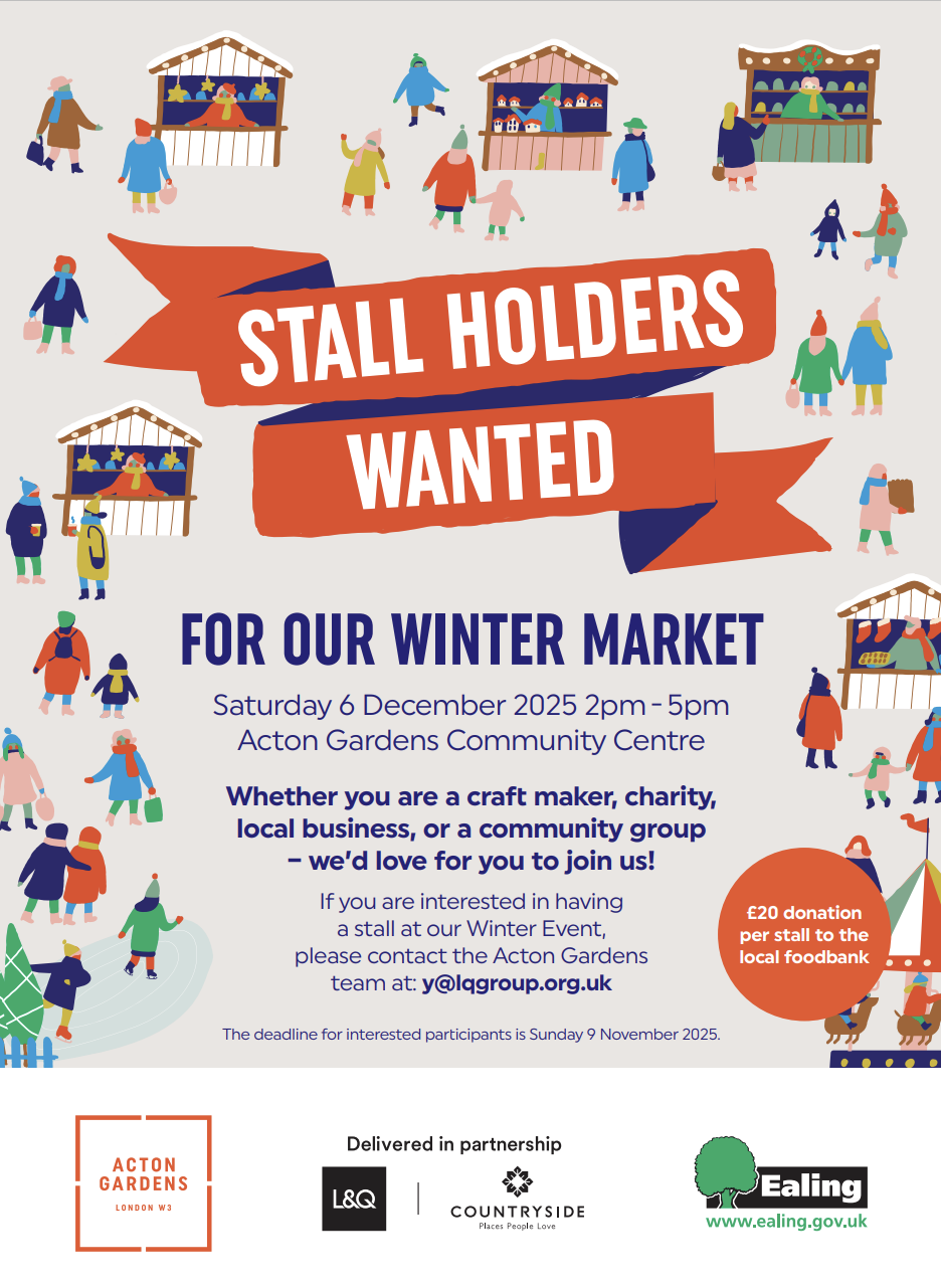 We are seeking stall holders for our Acton Gardens Winter Event, contact a member of the Communities Team at y@lqgroup.org.uk to discuss your stall idea!