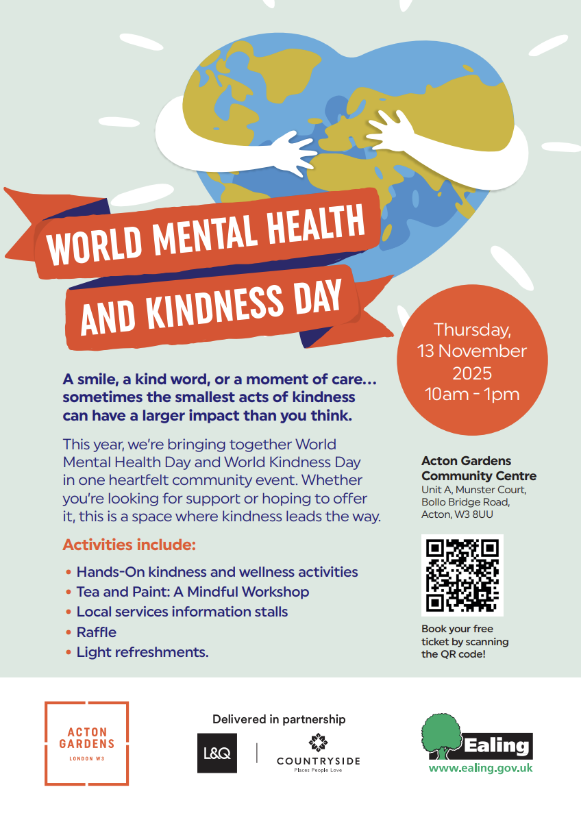 This year, we’re bringing together World Mental Health Day and World Kindness Day in one heartfelt community event. Whether you’re looking for support or hoping to offer it, this is a space where kindness leads the way. Join us on the 13 November, 10am til 1pm for wellness activities, local information stalls, and a space to unwind.